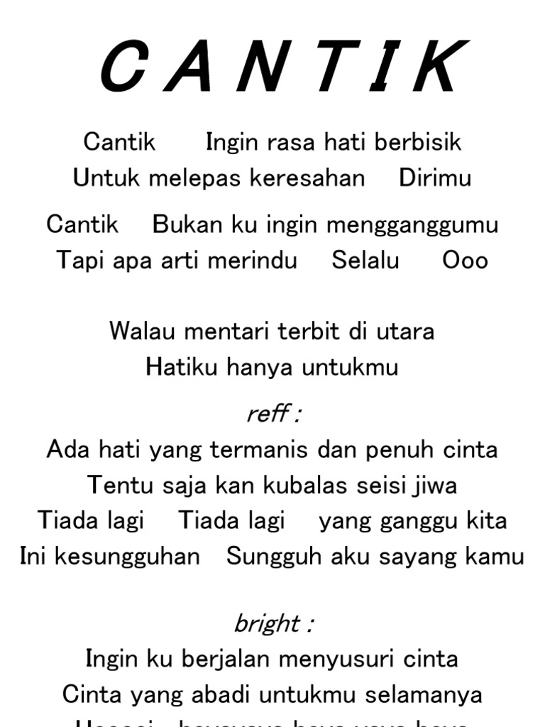 C c f c cantik ingin rasa hati berbisik f em dm untuk melepas keresahan dirimu oh c f c cantik bukan ku ingin menganggumu f em dm tapi apa arti merindu selalu wowo wo f dm walau mentari terbit di utara.